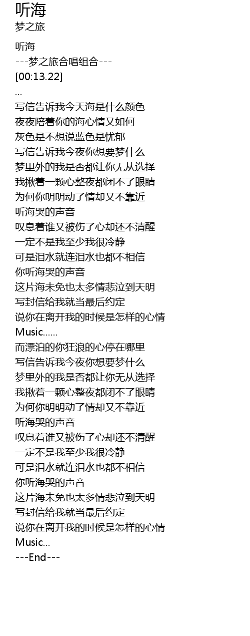 | [00:07.04] | ---梦之旅合唱组合--- |