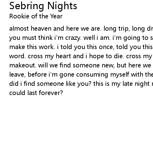 almost heaven and here we are. long trip, long drive to sing this song to you. you must think i'm crazy. well i am. i'm going to see this farther. i'm going to make this work. i told you this once, told you this twice. over and over it's my word. cross my heart and i hope to die. cross my heart. this is my late night makeout. will we find someone new, but here we are, i'm kissing you. before i leave, before i'm gone consuming myself with these things that fell apart. how did i find someone like you? this is my late night makeout. these sebring nights could last forever? |