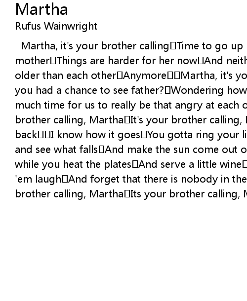 | Martha, it' s your brother calling Time to go up north and see mother Things are harder for her now And neither of us is really that much older than each other Anymore Martha, it' s your brother calling Have you had a chance to see father? Wondering how' s he doing and There' s not much time for us to really be that angry at each other Anymore It' s your brother calling, Martha It' s your brother calling, Martha Please call me back I know how it goes You gotta ring your little finger Hit the tree and see what falls And make the sun come out on Sunday afternoon All the while you heat the plates And serve a little wine And wear a hat and make ' em laugh And forget that there is nobody in the room Anymore It' s your brother calling, Martha Its your brother calling, Martha Please call me back |