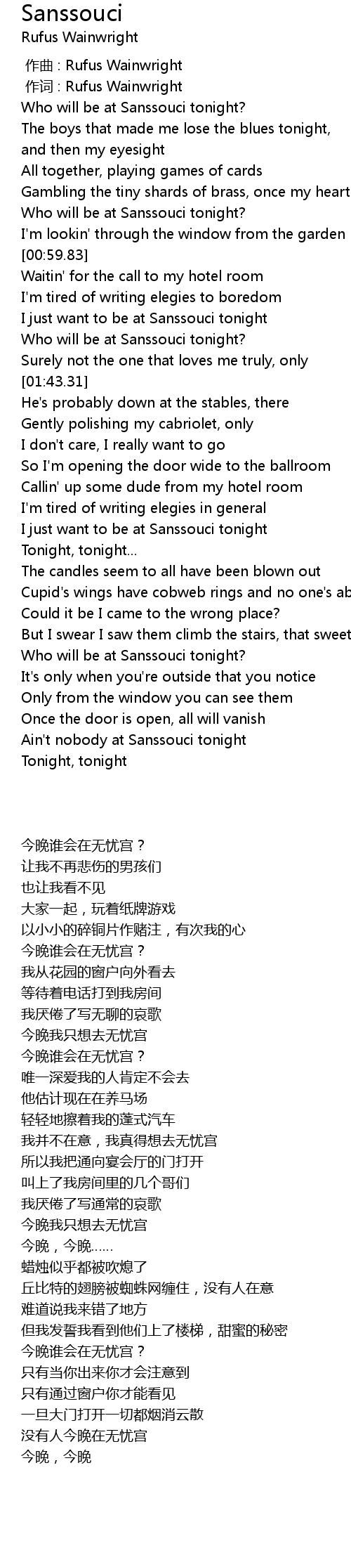 | [01:21.17] | I just want to be at Sanssouci tonight |