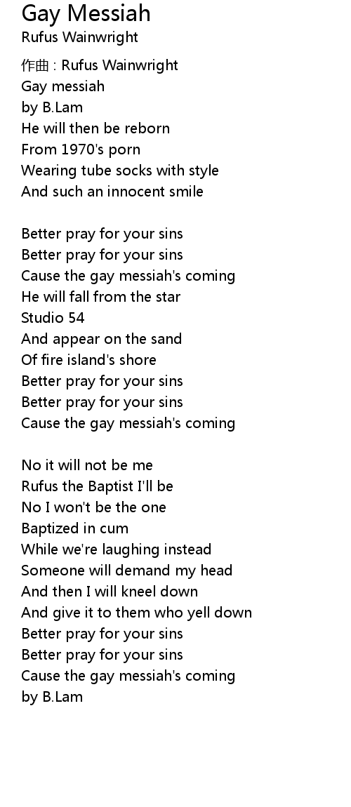 | Cause the gay messiah' s coming | |