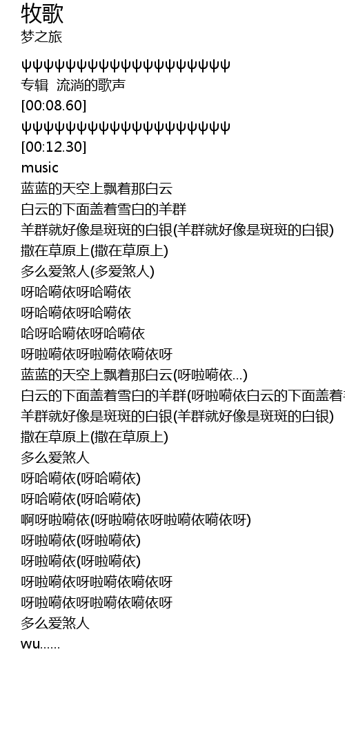 | [01:59.42] | 白云的下面盖着雪白的羊群(呀啦嗬依白云的下面盖着羊群) |