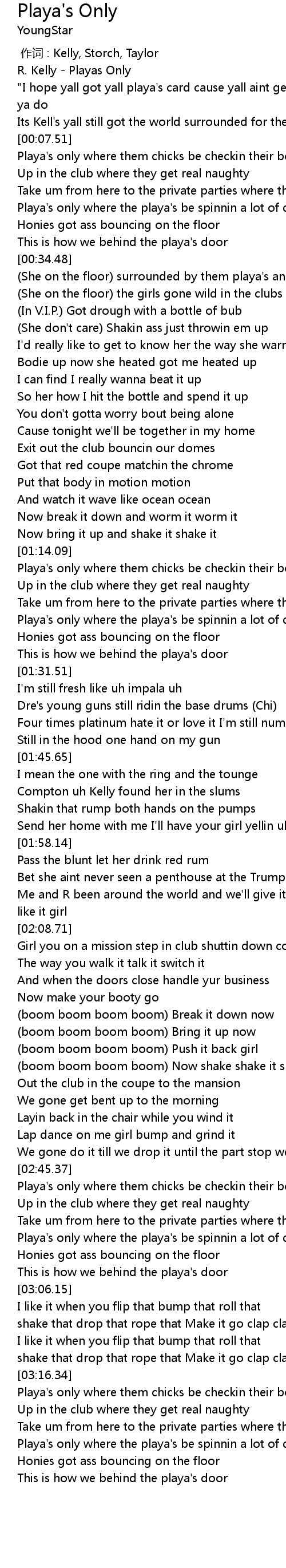 | [00:15.96] | Playa's only where them chicks be checkin their bodies |