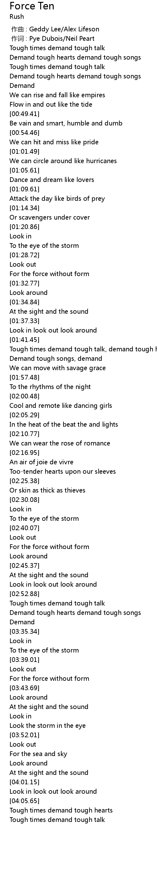 | [00:01.00] | 作词 : Pye Dubois/Neil Peart |