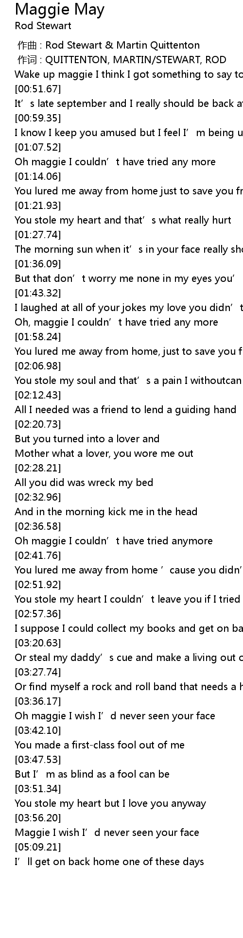 | [03:37.42] | Oh maggie I wish I' d never seen your face |