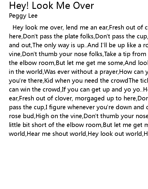 Hey look me over, lend me an ear,Fresh out of clover, morgaged up to here,Don't pass the plate folks,Don't pass the cup,I figure whenever you're down and out,The only way is up..And I'll be up like a rose bud,High on the vine,Don't thumb your nose folks,Take a tip from mine,I'm a little bit short of the elbow room,But let me get me some,And look out world, here I come...Nobody in the world,Was ever without a prayer,How can you win the world,If nobody knows you're there,Kid when you need the crowdThe tickets are hard to sell,Still you can win the crowd,If you can get up and yo yo..Hey look me over, lend me an ear,Fresh out of clover, morgaged up to here,Don't pass the plate folks,Don't pass the cup,I figure whenever you're down and out,The only way is up..Up like a rose bud,High on the vine,Don't thumb your nose folks,Take a tip from mine,I'm a little bit short of the elbow room,But let me get me some,And look out world,Hear me shout world,Hey look out world,Here I come! |
