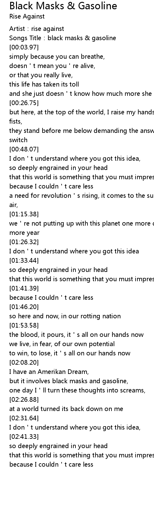 | [00:02.23] | Songs Title:black masks & gasoline |