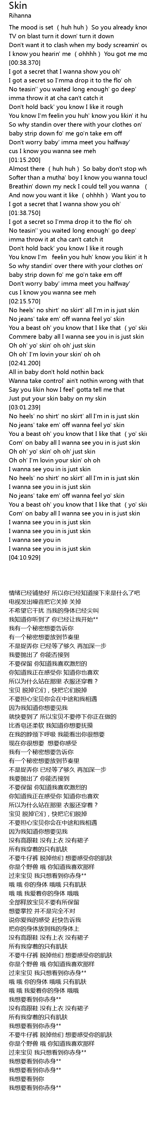 | [03:18.519] | Oh oh' yo' skin' oh oh' just skin |