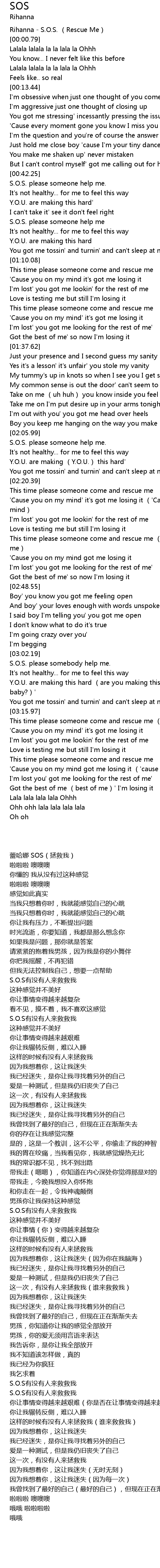 | [00:00.55] | 蕾哈娜 SOS(拯救我) |