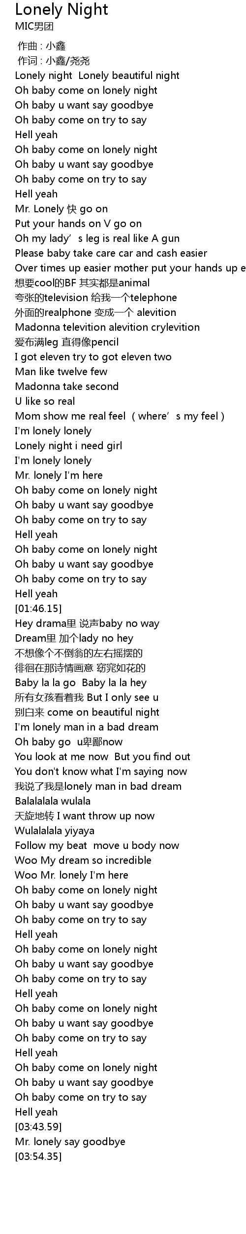 | [03:32.51] | Oh baby come on lonely night |