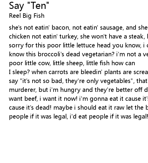 she's not eatin' bacon, not eatin' sausage, and she won't eat eggs, not eatin' chicken not eatin' turkey, she won't have a steak, but i just can't help feelin' sorry for this poor little lettuce head you know, i can't stop cryin' cause i know this broccoli's dead vegetarian? i'm not a vegetarian, vegetarian...she's a poor little cow, little sheep, little fish how can