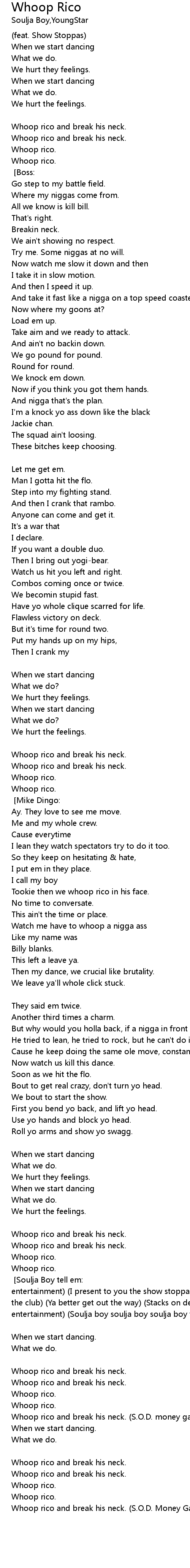 Whoop rico and break his neck [x2] [Soulja Boy tell em:] (S.O.D. money gang entertainment) (I present to you the show stoppas) (When this song come on in the club) (Ya better get out the way) (Stacks on deck) (S.O.D. money gang entertainment) (Soulja boy soulja boy soulja boy tell em) |