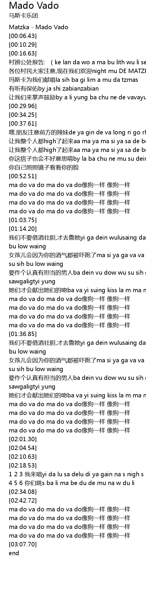 | [02:59.03] | ma do va do ma do va do像狗一样 像狗一样 |