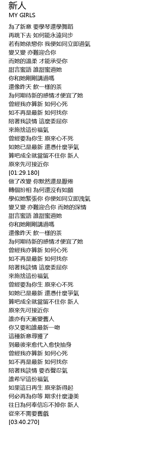 | [03:29.640] | 往日為何奉信忘不掉你 新人 |