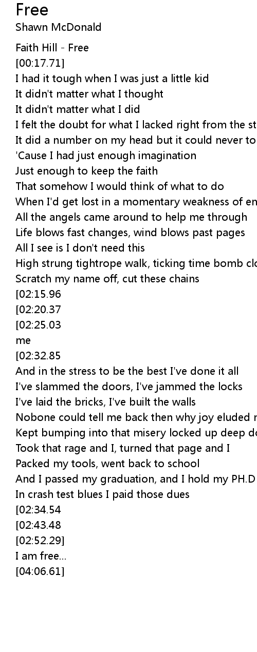 [03:16.75][02:20.37][01:17.27] I am free.. singing those words of wisdom
