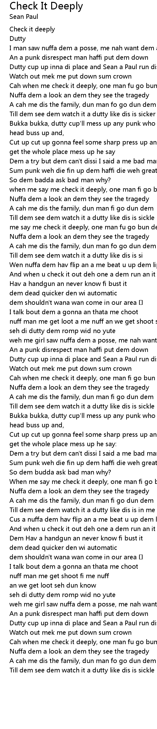 | Cut up cut up gonna feel some sharp press up an them know say Sean a Paul will get the whole place mess up he say | |