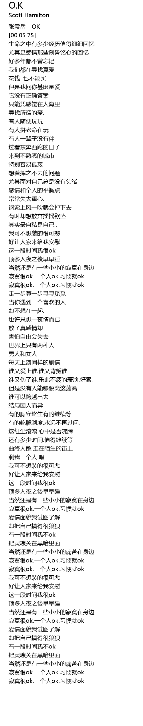 | [00:00.75] | 张震岳 - OK |