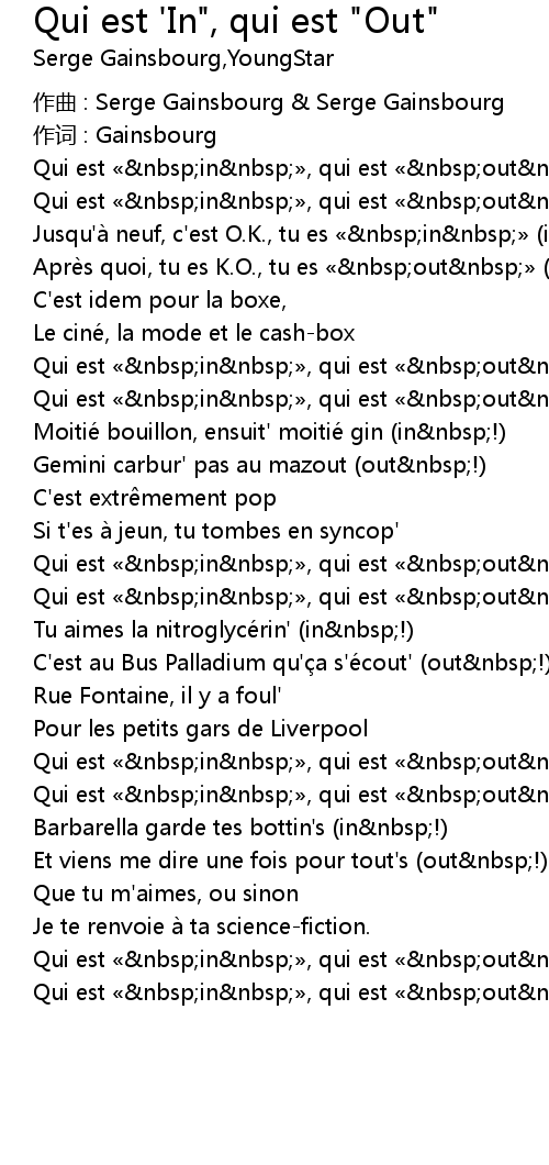 | 歌曲 | Qui est 'In", qui est "Out" |