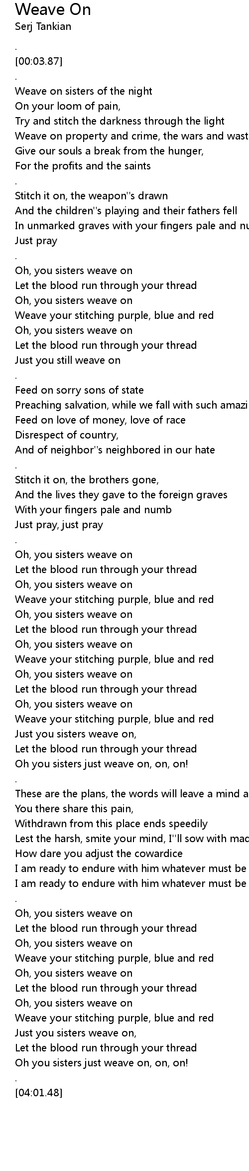 Oh you sisters just weave on, on, on! |