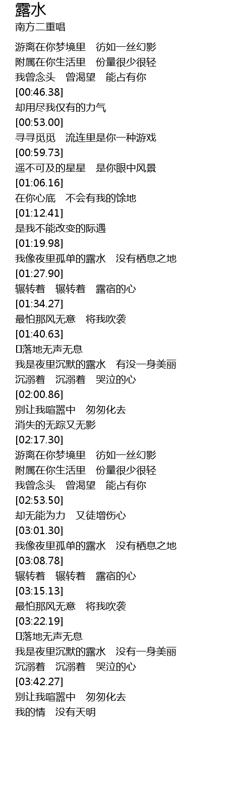 | [03:02.05] | 我像夜里孤单的露水 没有栖息之地 |