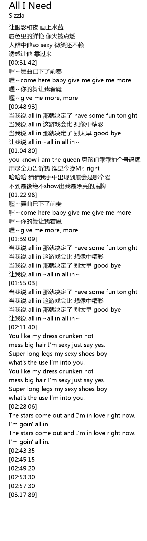 | [03:00.93][02:45.15] | 当我说 all in 那就决定了 have some fun tonight |