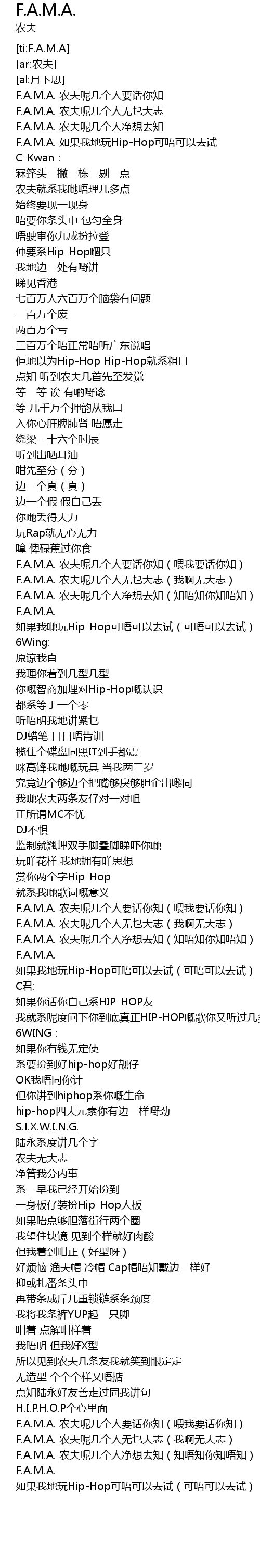 | [03:56.07] | F.A.M.A. 农夫呢几个人无乜大志(我啊无大志) |