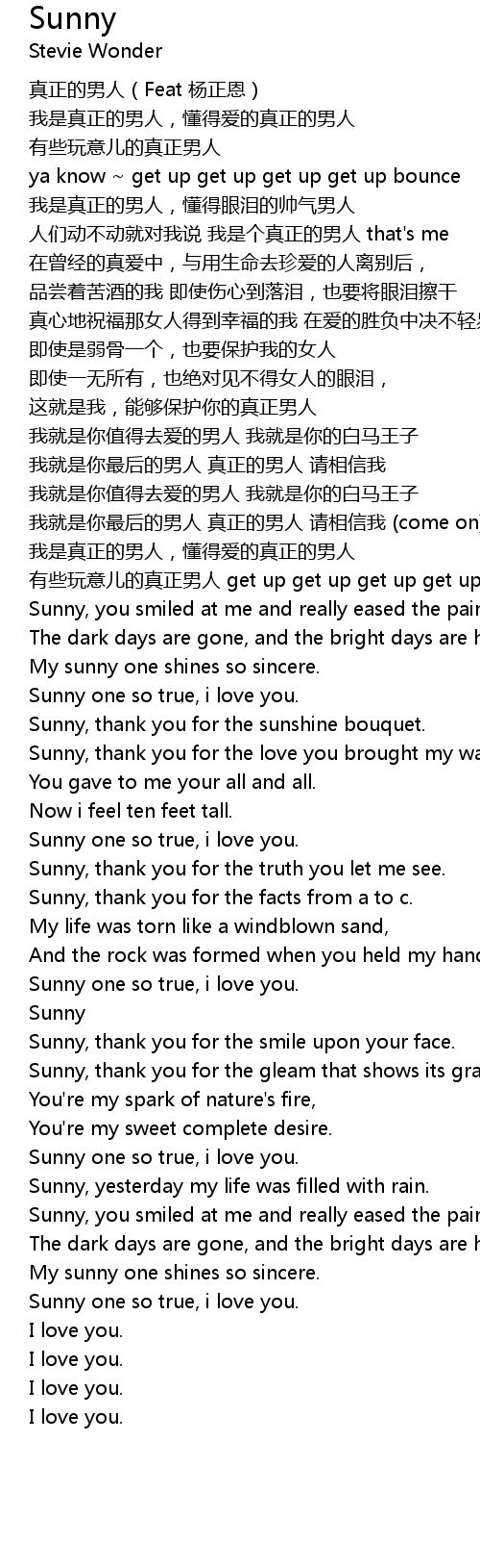 | [00:29.67] | zhēn zhèng de nán rén Feat yáng zhèng ēn wǒ shì zhēn zhèng de nán rén, dǒng de ài dí zhēn zhèng de nán rén yǒu xiē wán yì ér dí zhēn zhèng nán rén ya know get up get up get up get up bounce wǒ shì zhēn zhèng de nán rén, dǒng de yǎn lèi de shuài qì nán rén rén men dòng bù dòng jiù duì wǒ shuō wǒ shì gè zhēn zhèng de nán rén that' s me zài céng jīng dí zhēn ài zhōng, yǔ yòng shēng mìng qù zhēn ài de rén lí bié hòu, pǐn cháng zhe kǔ jiǔ de wǒ jí shǐ shāng xīn dào luò lèi, yě yào jiāng yǎn lèi cā gān zhēn xīn dì zhù fú nà nǚ rén dé dào xìng fú de wǒ zài ài de shèng fù zhōng jué bù qīng yì rèn shū jí shǐ shì ruò gǔ yí gè, yě yào bǎo hù wǒ de nǚ rén jí shǐ yī wú suǒ yǒu, yě jué duì jiàn bù dé nǚ rén de yǎn lèi, zhè jiù shì wǒ, néng gòu bǎo hù nǐ dí zhēn zhèng nán rén wǒ jiù shì nǐ zhí de qù ài de nán rén wǒ jiù shì nǐ de bái mǎ wáng zǐ wǒ jiù shì nǐ zuì hòu de nán rén zhēn zhèng de nán rén qǐng xiāng xìn wǒ wǒ jiù shì nǐ zhí de qù ài de nán rén wǒ jiù shì nǐ de bái mǎ wáng zǐ wǒ jiù shì nǐ zuì hòu de nán rén zhēn zhèng de nán rén qǐng xiāng xìn wǒ come on wǒ shì zhēn zhèng de nán rén, dǒng de ài dí zhēn zhèng de nán rén yǒu xiē wán yì ér dí zhēn zhèng nán rén get up get up get up get up bounce |