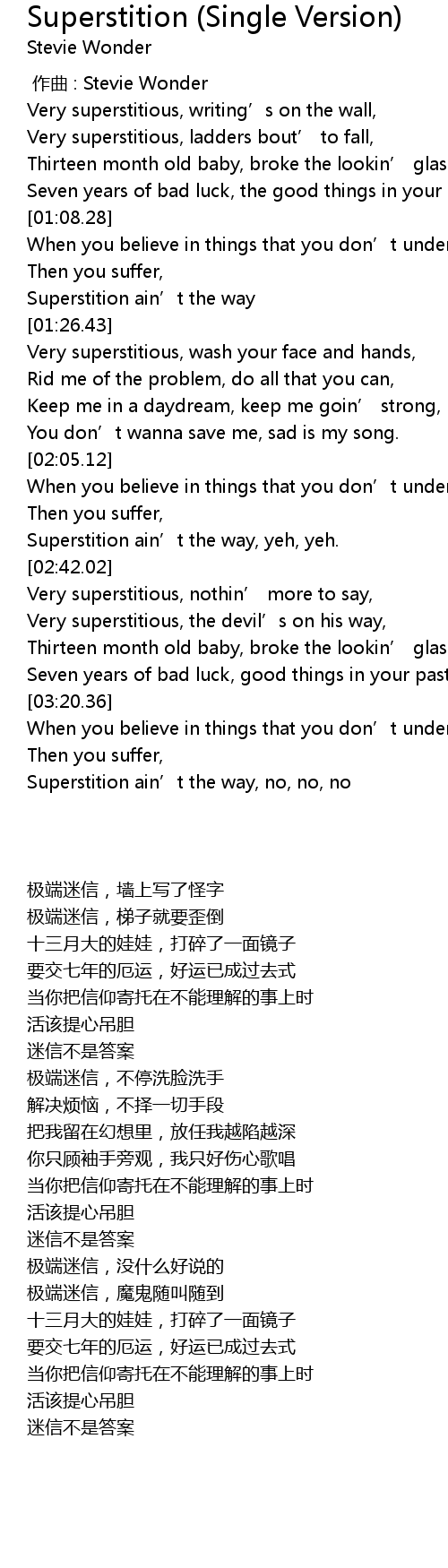| [02:13.31] | Superstition ain' t the way, yeh, yeh. |