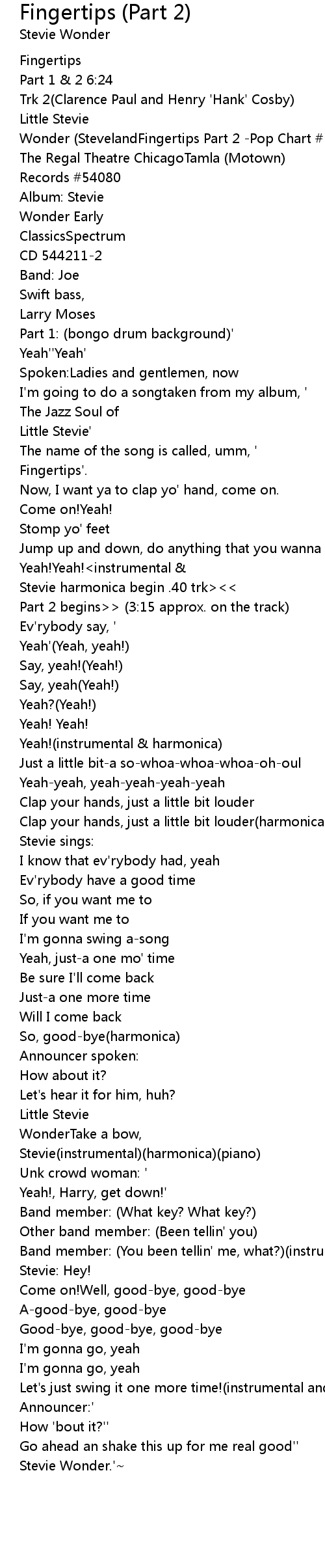 Wonder (StevelandFingertips Part 2 -Pop Chart #1 June 22, 1963Recorded: Live at The Regal Theatre ChicagoTamla (Motown) |