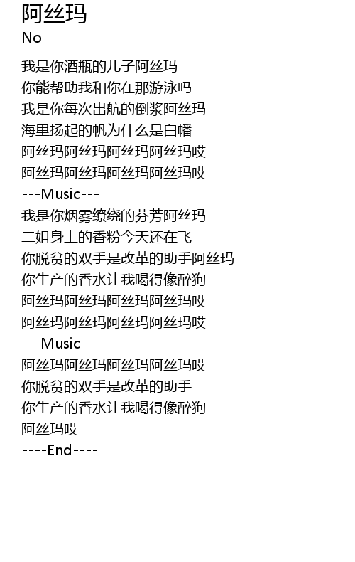 | [04:15.800] | 阿丝玛哎 |
