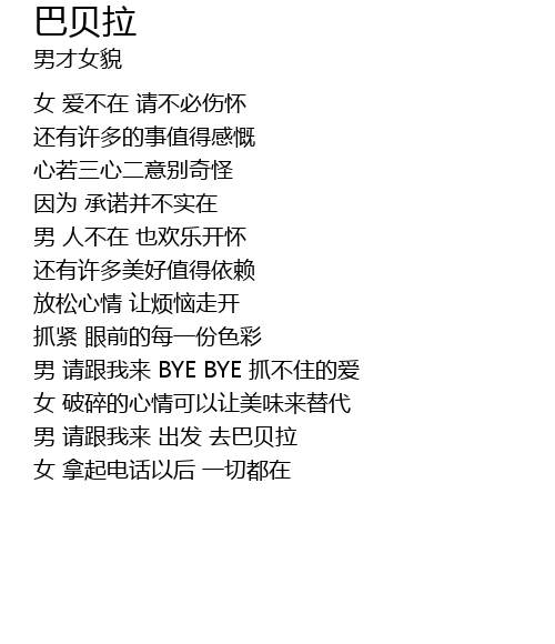 | [01:12.35] | nán qǐng gēn wǒ lái chū fā qù bā bèi lā |