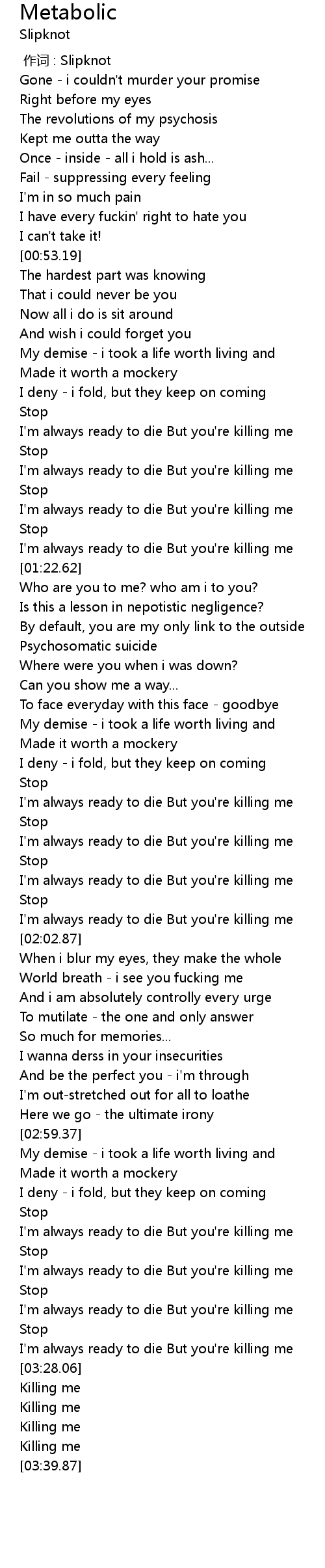 | [03:17.68] | I'm always ready to die But you're killing me |