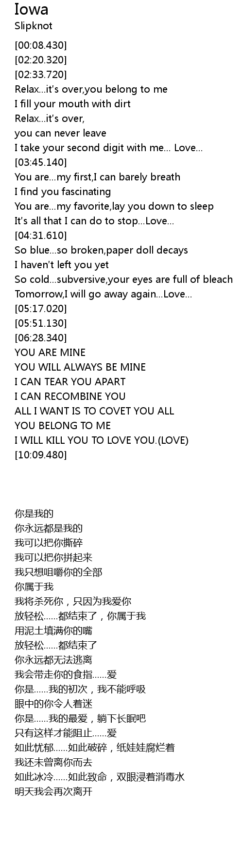 | [03:22.230] | Relax...it′s over,you belong to me |