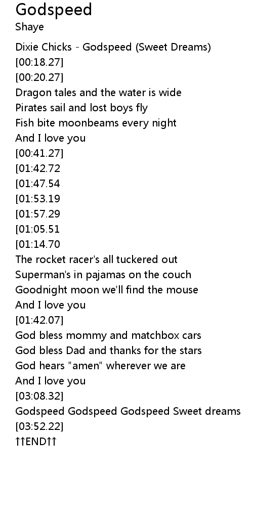 | [03:32.63] | Godspeed Godspeed Godspeed Sweet dreams |