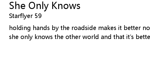 holding hands by the roadside makes it better nothing here can make it sadder she only knows the other world and that it's better she only knows no, no, no