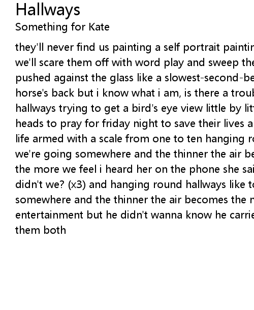 they'll never find us painting a self portrait painting ourselves into position we'll scare them off with word play and sweep them under the rug my face is pushed against the glass like a slowest-second-better off and thrown from the horse's back but i know what i am, is there a trouble with that? hanging round hallways trying to get a bird's eye view little by little (x2) they bow their heads to pray for friday night to save their lives and then they go on through life armed with a scale from one to ten hanging round hallways like to feel like we're going somewhere and the thinner the air becomes the more we feel at home the more we feel i heard her on the phone she said, you said, had a good day didn't we? (x3) and hanging round hallways like to feel like we're going somewhere and the thinner the air becomes the more we feel she said that's entertainment but he didn't wanna know he carried the shopping bag she carried them both