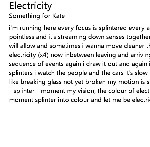 i'm running here every focus is splintered every attempt he can afford rendered pointless and it's streaming down senses together they move cleaner than transit will allow and sometimes i wanna move cleaner than transit will allow to be electricity (x4) now inbetween leaving and arriving i can try to digest this sequence of events again i draw it out and again i get delayed reaction i get splinters i watch the people and the cars it's slow motion they're beautiful like breaking glass not yet broken my motion is silver on the point of a moment - splinter - moment my vision, the colour of electricity (x4) moment splinter moment splinter into colour and let me be electricity (x4) |