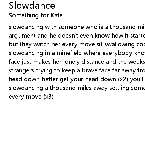 slowdancing with someone who is a thousand miles away settling someone else's argument and he doesn't even know how it started strangers dance with strangers but they watch her every move sit swallowing cocktails better get your head down slowdancing in a minefield where everybody knows your name and every familiar face just makes her lonely distance and the weeks gone by strangers dance with strangers trying to keep a brave face far away from danger you better get your head down better get your head down (x2) you'll be the talk of the town (x4) slowdancing a thousand miles away settling someone else's argument watch her every move (x3) |