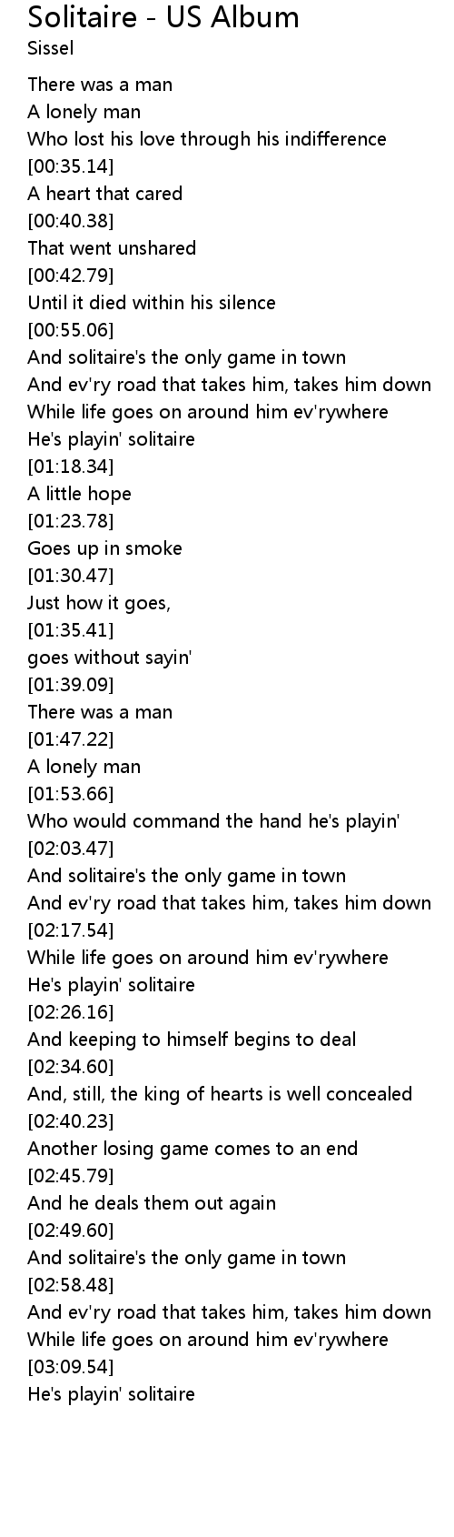 | [00:59.44] | And solitaire's the only game in town |