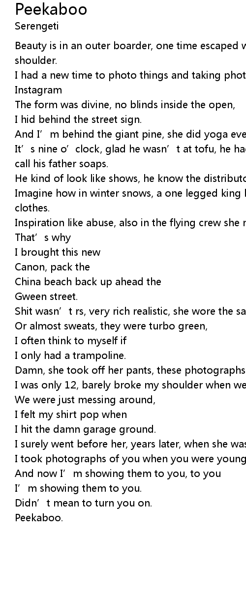 | And I' m behind the giant pine, she did yoga every night at about nine. | |