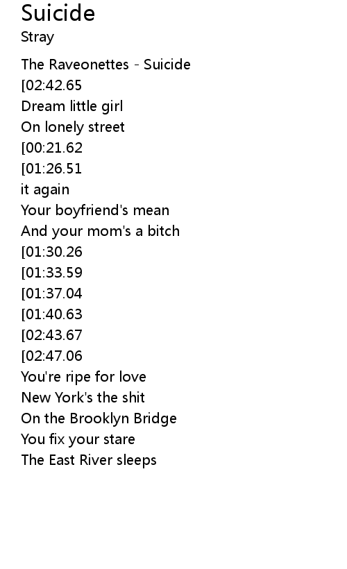 | [02:50.78][02:43.67][01:51.65][01:44.55][00:50.51][00:43.23] | Suicide |