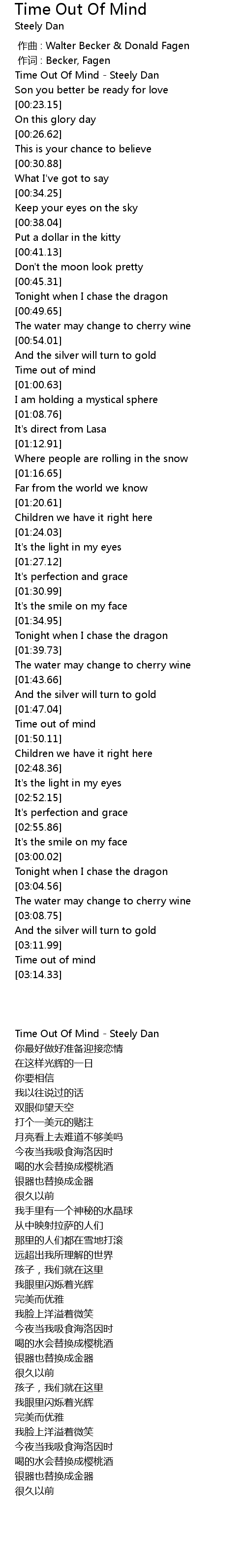 | [00:00.61] | Time Out Of Mind - Steely Dan |