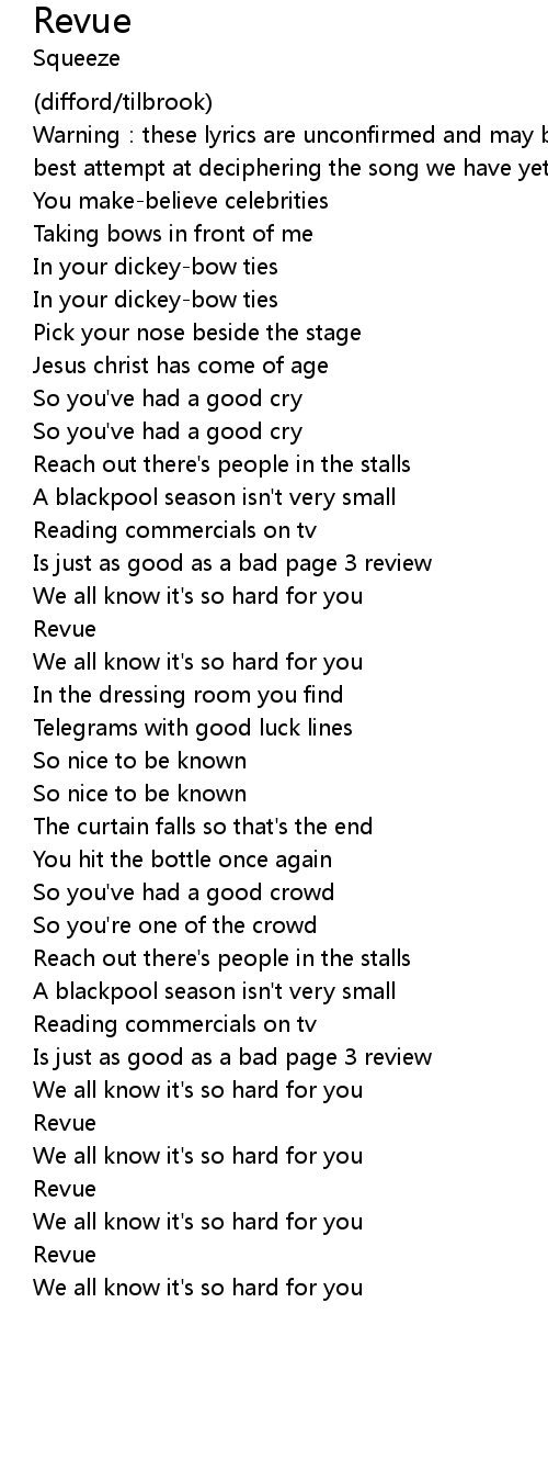 | Warning: these lyrics are unconfirmed and may be inaccurate. they represent the best attempt at deciphering the song we have yet to see. | |
