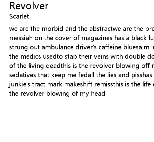 we are the morbid and the abstractwe are the breeding mammals with bad backsour messiah on the cover of magazines has a black lung an i.v. of nicotinewith strung out ambulance driver's caffeine bluesa.m. rendezvousfeeling the needles the medics usedto stab their veins with double doses by the twosthis is the life of the living deadthis is the revolver blowing off my headthese are the sedatives that keep me fedall the lies and pisshas it come down to thisa junkie's tract mark makeshift remissthis is the life of the living deadthis is the revolver blowing of my head |