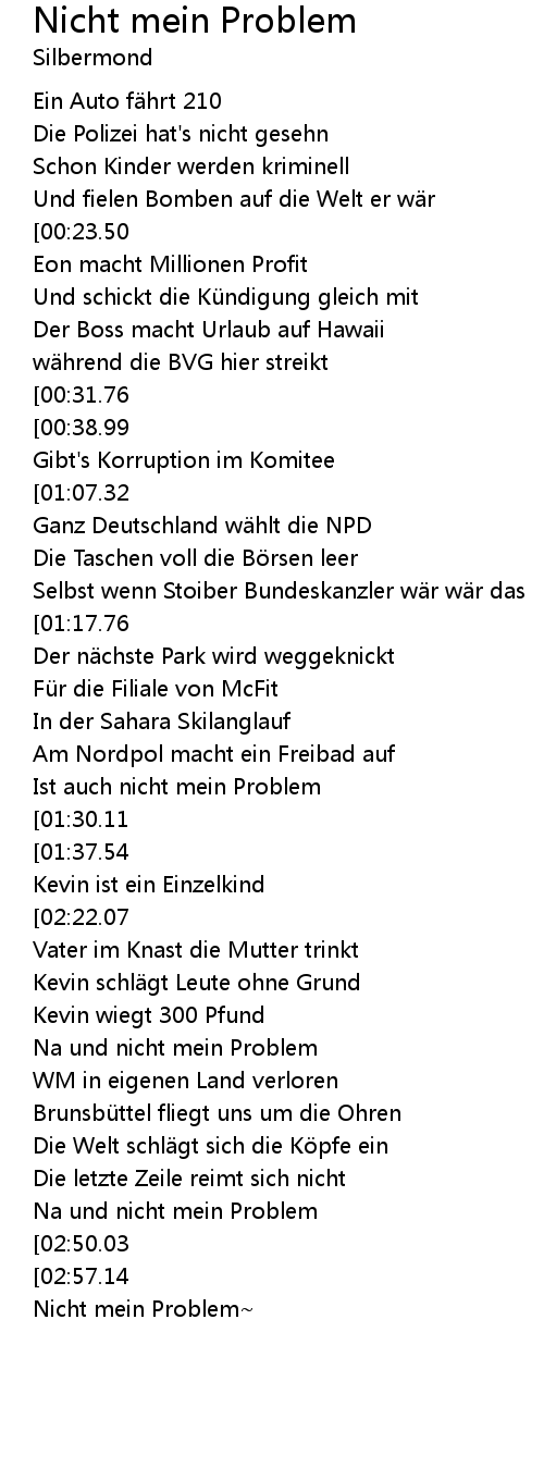 | [00:08.73][00:23.50][00:20.14][00:16.62] | Nicht mein Problem |