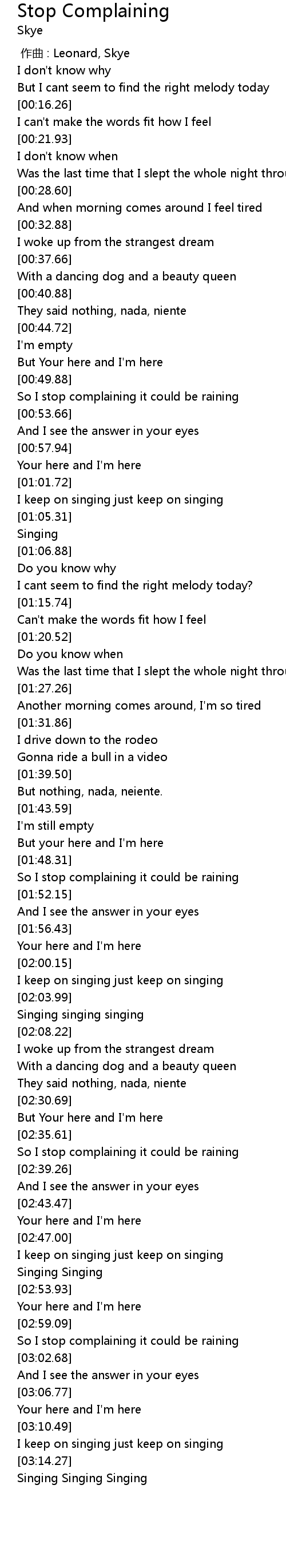 | [02:59.66] | So I stop complaining it could be raining |