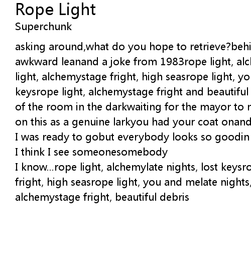 I know...rope light, alchemylate nights, lost keysrope light, alchemystage fright, high seasrope light, you and melate nights, lost keysrope light, alchemystage fright, beautiful debris