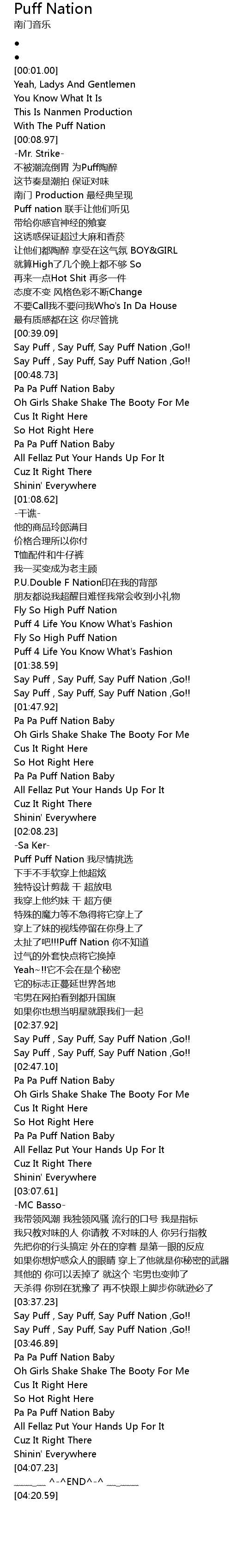 | [00:43.89] | Say Puff , Say Puff, Say Puff Nation , Go!! |