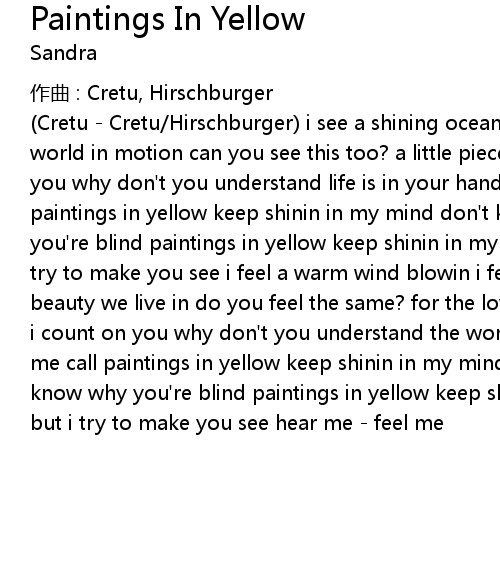| Cretu Cretu Hirschburger i see a shining ocean i see a sky so blue i see a world in motion can you see this too? a little piece is dyin a little piece in you why don' t you understand life is in your hands see the dream i have paintings in yellow keep shinin in my mind don' t know why i just don' t know why you' re blind paintings in yellow keep shinin in my heart don' t know how but i try to make you see i feel a warm wind blowin i feel the sun and rain i feel the beauty we live in do you feel the same? for the love that i' m feelin i rely and i count on you why don' t you understand the world is in your hands can you hear me call paintings in yellow keep shinin in my mind don' t know why i just don' t know why you' re blind paintings in yellow keep shinin in my heart don' t know how but i try to make you see hear me feel me |