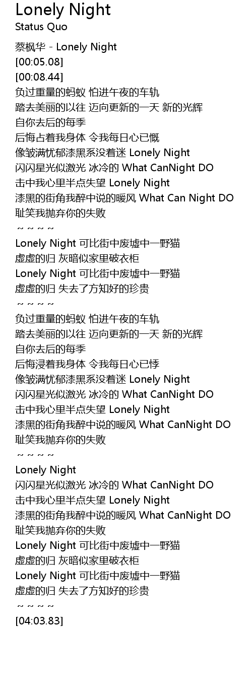 | [00:01.36] | 蔡枫华 - Lonely Night |